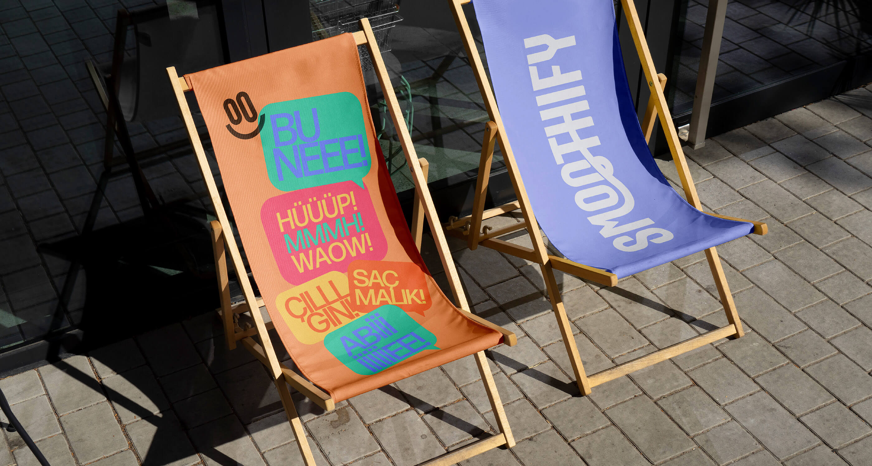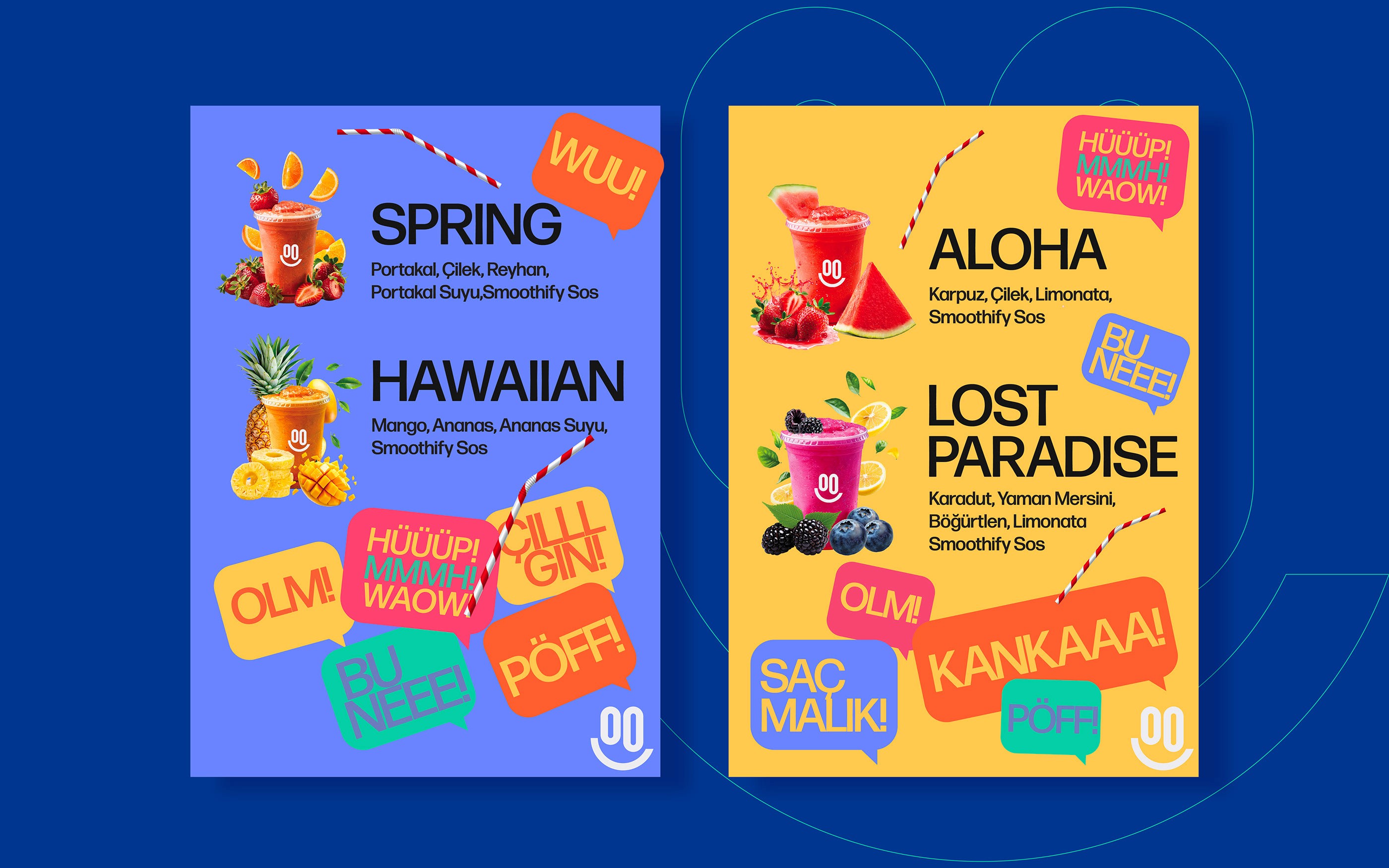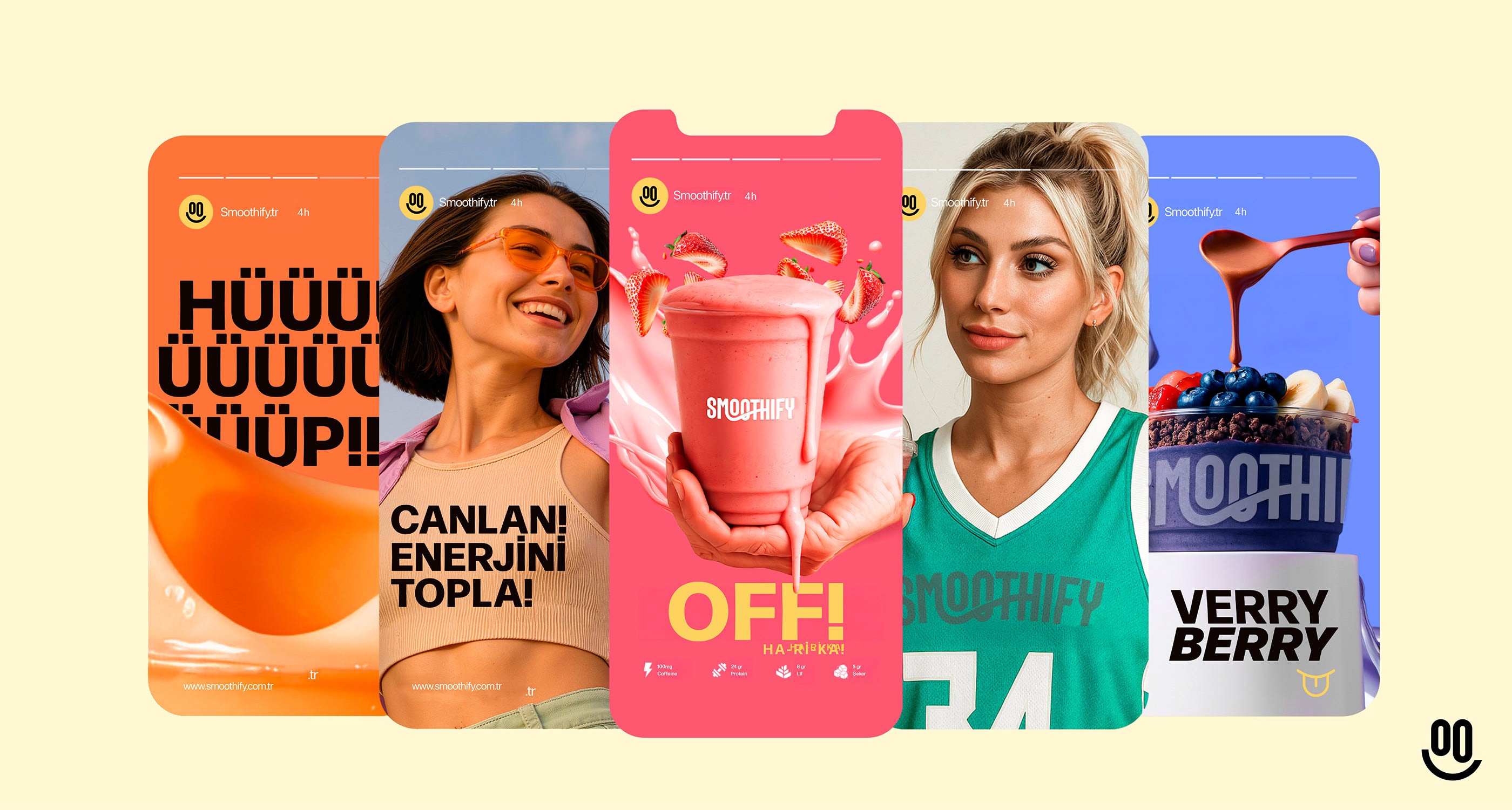 Marka dili; yüksek kontrastlı canlı renk paleti, güçlü bir logotype, smile ikon dili ve modüler grafik öğeler üzerine kuruldu. Bu sistem; kiosk tasarımı, bardak/packaging, menü ve sosyal medya gibi tüm temas noktalarında aynı enerjiyi koruyarak Smoothify’ı her lokasyonda tutarlı, akılda kalan ve hızlı uygulanabilir bir görsel imzaya dönüştürdü.